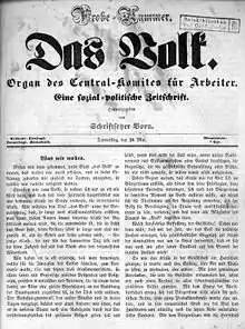 Sin embargo, Born discrepaba de Marx sobre la posibilidad de que el programa revolucionario contenido en el Manifiesto Comunista, publicado en Londres en febrero, pudiera aplicarse en Alemania pues creía que ni siquiera sería comprendido por los obreros. Así pues abogaba por la vía reformista para la mejora de las condiciones de vida de los trabajadores mediante la aprobación de una serie de leyes de protección del trabajo, como los seguros de enfermedad, invalidez y vejez o la extensión de la educación gratuita, y también mediante la organización de cooperativas de producción. Se trataba, como ha destacado Jacques Droz, de un «programa estrictamente reformista que está más cercano a Louis Blanc que a Marx, y con el que se esforzaba por no ahuyentar a la pequeña y mediana burguesía, a la cual quería conservar a toda costa en el "frente revolucionario"; no aceptaba, por tanto, el "querer colocar a toda la sociedad bajo la supremacía de la clase obrera"».[3]