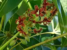 Sterculia foetida es un árbol de madera blanda que puede crecer hasta 35 metros (115 pies) de altura.[2] Fue descrito en 1753 por Carl Linnaeus.[3] Los nombres comunes para la planta son almendro de la India, el olivo de Java, el esterculia avellana y el almendro silvestre.[4] Es una especie del género Sterculia que significa mal olor: el origen de Sterculia proviene del dios romano, Sterquilinus, que era el dios de los fertilizantes o estiércol.