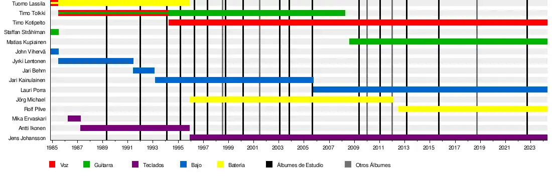 Actualmente, la banda no cuenta con ningún miembro original, pero el miembro más antiguo es su vocalista, Timo Kotipelto, seguido por el teclista Jens Johansson.