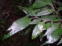 Las hojas son delgadas con un gran extremo puntiagudo. De 5 a 8 cm de largo, alternadas y simples. Con frecuencia finamente dentadas. El envés es velloso, el haz es brilloso de color verde de un tono mediano. La nervadura es más evidente en el envés. A diferencia de otras especies, las venas laterales no terminan en la dentadura de la hoja.