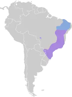 Se puede encontrar en Brasil y Paraguay. Su hábitat natural son los bosques templados, bosques húmedos, bosques montanos y ambientes con altos niveles de degradación.