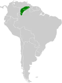 Su hábitat natural son los bosques húmedos tropicales y subtropicales, y las praderas inundables de los tepuyes hasta los 2.500 m de altitud.[4] Puede encontrarse en Brasil, Guayana y Venezuela.[5] Aunque su población no ha sido contabilizada se la considera bastante común aunque se sospecha una tendencia en declive.[6]