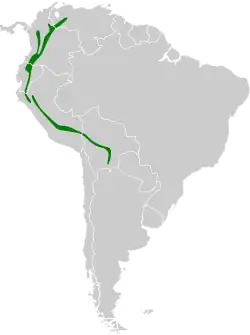 Su hábitat natural son los bosques húmedos y matorrales en Bolivia, Colombia, Ecuador, Perú y Venezuela. Está clasificado como Preocupación menor por la IUCN.[1]