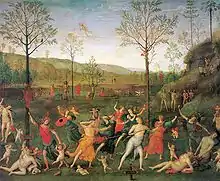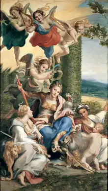 - Combate del Amor y la Castidad, de Perugino] cuyo programa iconográfico fue propuesto por Paride da Ceresara que era un humanista y astrólogo de la corte. El cuadro fue pintado en Florencia y enviado terminado a Mantua en 1505.[1]