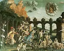 - Parnaso que fue realizado entre 1496 y 1497, con una iconografía compleja pero donde los contemporáneos reconocieron a Isabel de Este en la figura de Venus[1] y Minerve chassant les Vices du jardin de la Vertu, de Andrea Mantegna.
