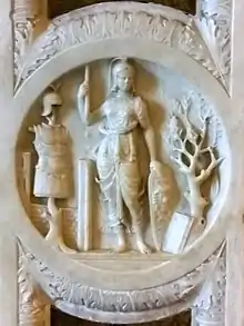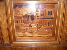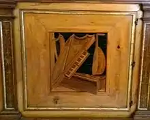 - La puerta con incrustaciones de mármoles de colores que se abría hacia el studiolo, realizada por Gian Cristoforo Romano a principios de los años 1500.[1]