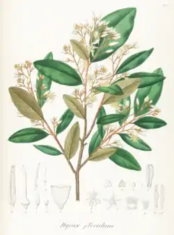 Es un árbol que alcanza los 10 metros de altura, sus hojas son ovales, enteras y cubiertas de pelusa blanquecina. Las flores, de color blanco, se encuentran agrupadas. Su fruto es ovoide de 1 cm de diámetro que contiene una semilla. Se denomina popularmente benjuí