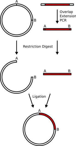 Utilizamos enzimas de restricción para extraer el gen de interés del primer vector. Después es purificado de entre todos los restos y fragmentos. Una vez purificados, amplificamos las secuencias mediante PCR.