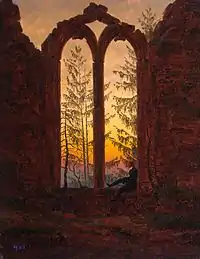 Quizá el más prototípico artista de lo sublime fue el alemán Caspar David Friedrich, que tenía una visión panteísta y poética de la naturaleza, una naturaleza incorrupta e idealizada donde la figura humana tan solo representa el papel de un espectador de la grandiosidad e infinitud de la naturaleza –obsérvese que generalmente las figuras de Friedrich aparecen de espaldas, como dando paso a la contemplación de la gran vastedad del espacio que nos ofrece–. Entre sus obras destacan: Dolmen en la nieve (1807), La cruz en la montaña (1808), El monje junto al mar (1808-1810), Abadía en el robledal (1809), Arco iris en un paisaje de montañas (1809-1810), Acantilados blancos en Rügen (1818), El caminante sobre el mar de nubes (1818), Dos hombres contemplando la luna (1819), Océano glacial (Naufragio de la “Esperanza”) (1823-1824), El gran vedado (1832), etc.[11]