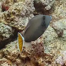 - Esta obra contiene una traducción derivada de «Sufflamen chrysopterum» de Wikipedia en catalán, publicada por sus editores bajo la Licencia de documentación libre de GNU y la Licencia Creative Commons Atribución-CompartirIgual 4.0 Internacional.
