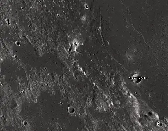![]() Cráteres satélites de Sulpicius Gallus, fotografiados desde la Tierra en 2012 en el Observatorio Bayfordbury de la Universidad de Hertfordshire con los telescopios Meade LX200 14" y Lumenera Skynyx 2-1 |