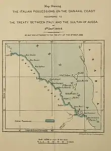 El conde Tornielli declaró al marqués de Salisbury que el artículo 5 del tratado celebrado entre los italianos y el sultán Mahammad Hanfare. Que en el caso de que cualquier otra potencia intente ocupar Aussa o cualquier parte de su territorio, el sultán debe oponerse y declarar que su nación es un protectorado italiano y debe izar la bandera italiana.[16] Según el artículo 3, el sultán había reconocido toda la costa de Danakil desde la bahía de Amphila hasta Ras Doumeira como posesión italiana y había concedido los territorios de Gambo Kona y Ablis como parte de la Eritrea italiana.[17][18]