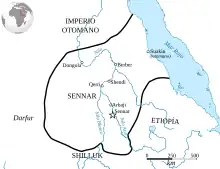 ![]() El sultanato de Sennar y estados limítrofes hacia 1750. | |||||||||||||||||||||||||||||||