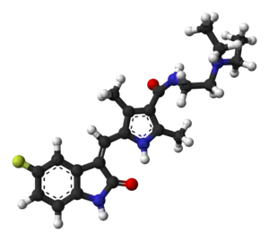 El sunitinib (comercializado como Sutent, y previamente conocido como SU11248) es una pequeña molécula, de administración oral, con múltiples sitios blanco, constituidos por los receptores de tirosina quinasa (RTK), este inhibidor fue aprobado por la FDA para el tratamiento del carcinoma de células renales (CCR) y tumores del estroma gastrointestinal (GIST) resistentes al imatinib el 26 de enero de 2006. El sunitinib fue el primer medicamento que simultáneamente fue aprobado para dos indicaciones diferentes.[1] El sunitinib se convirtió en estándar para el tratamiento de ambos tipos de cáncer, y está siendo actualmente estudiado para el tratamiento de muchos otros.