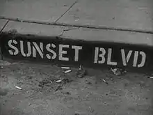 La película comienza con el plano de una acera. La cámara se mueve hasta dejar ver que en el bordillo pone "Sunset Blvd." Comienza a moverse, en un ángulo picado, sobre el pavimento de Sunset Boulevard, con los títulos de crédito sobreimpresionados. Cuando los títulos de crédito han cesado de aparecer, la cámara se mueve hasta adoptar una angulación normal: aparece una comitiva de motocicletas y coches de la policía. Una voz en off explica que se ha cometido un asesinato en una de las grandes mansiones del bloque 10.000. Mientras la voz continúa hablando, se muestra la llegada de policías y periodistas a la mansión. En la piscina se encuentra el cadáver de un joven. La voz en off explica que es un simple guionista, que "siempre quiso una piscina. Bueno, al final consiguió una. Solo que el precio resultó ser un poco alto".[6] Hay un fundido y la voz, que es la del propio muerto, empieza a explicar cómo ocurrió todo, en un flashback que se extenderá por la mayor parte de la película. La acción comienza seis meses atrás. La cámara entra por la ventana en el apartamento en el que Joe Gillis, un guionista en horas bajas -el futuro cadáver en la piscina- se encuentra escribiendo a máquina, vestido solo con un albornoz. Es interrumpido por dos cobradores que traen una orden judicial para llevarse su coche, un Plymouth convertible con matrícula de California 40 R 116, por impago. Gillis se excusa diciendo que lo ha dejado a un amigo para ir a Palm Springs. Los cobradores anuncian que regresarán por el coche al día siguiente al mediodía, y se marchan.
