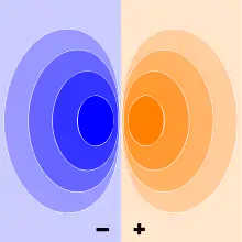 Superficies equipotenciales de un dipolo eléctrico: las líneas de la figura representan la intersección de las superficies equipotenciales con el plano de simetría paralelo al momento dipolar.