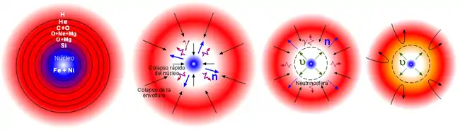 El núcleo se contrae tan rápido que deja un espacio de baja densidad casi vacío entre él y el resto de la estrella. La envoltura, por su parte, empieza a caer sobre el núcleo frenándose por un aluvión de fotones de frecuencia extrema, que fotodesintegran las capas más interiores de dicha envoltura. Esta destrucción de núcleos no solo transmite momento sino que también produce un flujo de neutrones y protones que serán capturados por las capas siguientes para formar elementos más pesados. Simultáneamente, las densidades enormes que se alcanzan en la «sopa» de núcleos pesados y electrones en que se ha convertido el núcleo supercompactado, posibilitan una nueva reacción. Los electrones del núcleo estelar empiezan a caer sobre los núcleos atómicos reaccionando con los protones para formar neutrones en un proceso llamado captura de electrones por lo que, poco a poco, el núcleo se va convirtiendo en una masa de neutrones hiperdensa llamada neutronium. Los procesos de fotodesintegración y de captura de electrones aceleran aún más el hundimiento de la estrella, ya que, además, ahora también la presión de degeneración pierde fuerza rápidamente.