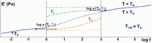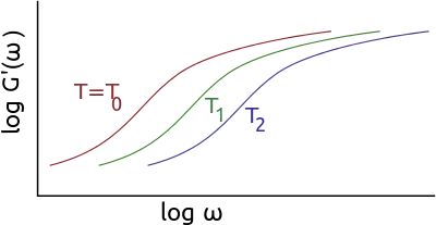 En el rango de frecuencia [ω1, ω2], si la temperatura aumenta desde T0, el módulo complejo E' (ω) disminuye. Esto equivale a explorar una parte de la curva maestra correspondiente a frecuencias inferiores a ω1 mientras mantiene la temperatura en T0. Por el contrario, bajar la temperatura corresponde a la exploración de la parte de la curva correspondiente a las altas frecuencias. Para una temperatura de referencia T0, los cambios de las curvas de módulo tienen el log de amplitud (aT). En el área de la transición vítrea, aT se describe mediante una función homogénea de la temperatura.