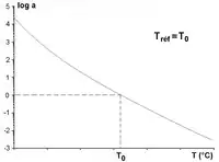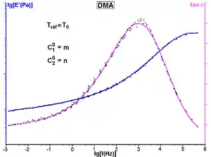 donde es el logaritmo decádico y C1 y C2 son constantes positivas que dependen del material y la temperatura de referencia. Esta relación se mantiene solo en el rango de temperatura aproximado [Tg, Tg + 100 °C]. Para determinar las constantes, se calcula el factor aT para cada componente M' y M del módulo complejo medido M*. Una buena correlación entre los dos factores de desplazamiento da los valores de los coeficientes C1 y C2 que caracterizan al material.