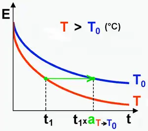 Sea el módulo de relajación E a dos temperaturas T y T0 tales que T > T0. Con un esfuerzo constante, el estrés se relaja más rápidamente a una temperatura más alta. El principio de superposición de tiempo-temperatura establece que el cambio de temperatura de T a T0 es equivalente a multiplicar la escala de tiempo por un factor constante aT que es solo una función de las dos temperaturas T y T0. En otras palabras,
