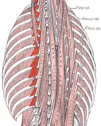 Los músculos supracostales ([TA]: musculi levatores costarum) o elevadores de las costillas son 12 músculos en forma de abanico que elevan las costillas, aunque su papel en la inspiración normal, si tienen alguno, no está claro. Puede participar en el movimiento vertebral y/o la propiocepción. Los músculos intercostales ocupan los espacios intercostales . La capa superficial está formada por los intercostales externos, y la capa interna por los intercostales internos. A las fibras más profundas de estos últimos, dispuestas internamente en los vasos intercostales, se les designa, un tanto artificialmente, como un músculo diferenciado, los intercostales íntimos.