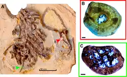 Espécimen de S. anatoceps (A) y ejemplos de secciones transversales (B-C).
