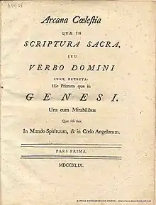 Los fundamentos de la teología de Swedenborg se establecieron en Arcana Cœlestia (Misterios Celestiales), publicado en ocho volúmenes en latín entre 1749 y 1756. En una parte importante de esa obra, interpreta los pasajes bíblicos del Génesis y del Éxodo. Revisa lo que, según él, es el sentido espiritual interno de estas dos obras de la Palabra de Dios. (Más tarde hizo una revisión similar del sentido interno del libro del Apocalipsis en Apocalipsis Revelado[24]). En particular, estaba convencido de que la Biblia describe la transformación del ser humano de un ser materialista a uno espiritual, lo que él llamaba renacimiento o regeneración. Comienza esta obra esbozando cómo el mito de la creación no era un relato de la creación de la Tierra, sino un relato del renacimiento o regeneración del ser humano en seis pasos representados por los seis días de la creación. Todo lo relacionado con la humanidad en la Biblia podía relacionarse también con Jesucristo, y cómo Cristo se liberó a sí mismo de los límites materialistas mediante la glorificación de su presencia humana haciéndola divina. Swedenborg examina esta idea en su exposición del Génesis y del Éxodo.[25]