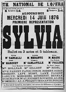 Cuando Sylvia fue estrenada el 14 de junio de 1876 en el Palais Garnier, fue ignorada ampliamente. De hecho, las primeras siete producciones de Sylvia no tuvieron éxito. Fue con su recuperación en 1952, con una coreografía nueva de Sir Frederick Ashton, que se popularizó. La exitosa puesta en escena de Ashton se usó en las producciones de 1997, 2004 y 2005, y casi todas están basadas en su coreografía de 1952. El número más popular del ballet es el Pizzicato (escuchar).