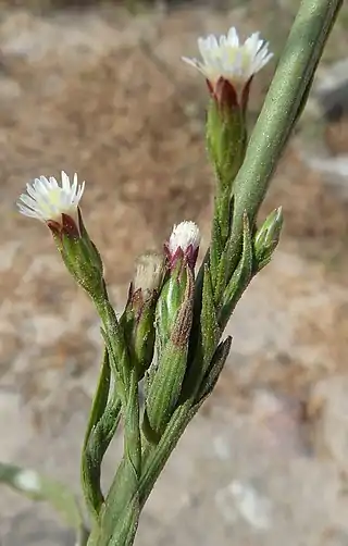 Es una planta herbácea que puede alcanzar unos 2 m de altura, generalmente muy ramificada, con hojas linear-lanceoladas enteras o discretamente denticuladas, sentadas semiabrazadoras, con un nervio medio dorsal que se prolonga abajo en el tallo hasta la hoja anterior, y que son cada vez más pequeñas —hasta llegar a inconspicuas— hacia el ápice de la planta. Los capítulos, diminutos, se organizan en una inflorescencia de panículas laxas. Las brácteas del involucro son lanceoladas, desiguales, de ápice agudo y, a menudo, de color violáceo, mientras el receptáculo, alveolado, carece de páleas. Las flores, solitarias en el ápice de pedúnculos escamosos que nacen en la axila de las hojas, son de color blanco o blanquecino-violáceo, liguladas y femeninas las periféricas y flósculosas y hermafroditas las centrales. Las cipselas, de 1,5-3mm de largo por 0,5mm de ancho, tienen un vilano de una única fila de pelos ásperos algo más largos que su cuerpo, el cual es discretamente pubescente, de sección pentagonal y con costillas longitudinales más o menos marcadas.[1]