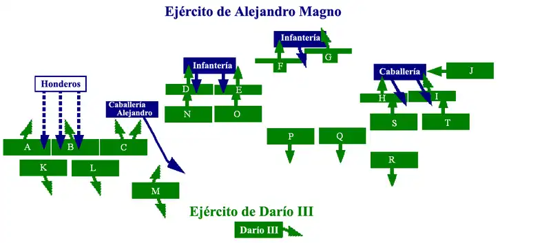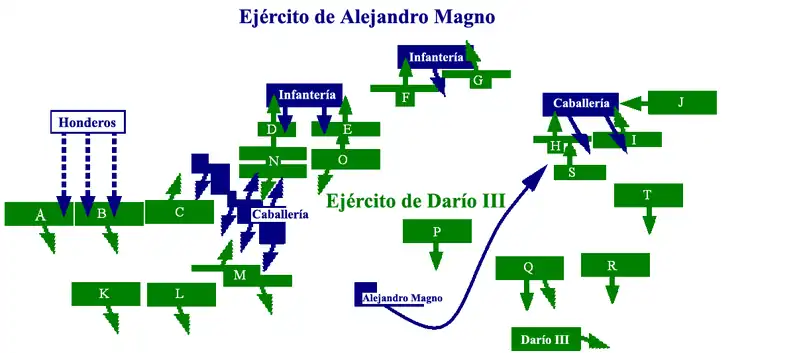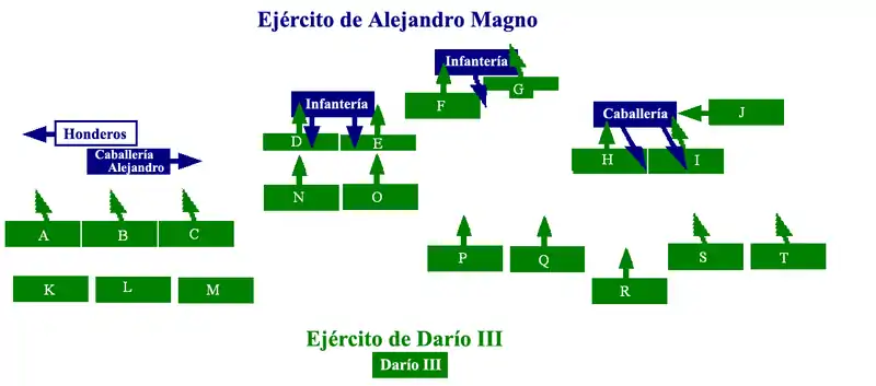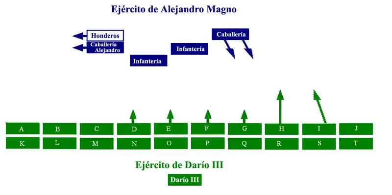 Con el fin de no dejarse rodear por la innumerable caballería persa, Alejandro decidió disponer a sus tropas en niveles, algo completamente innovador en la Antigüedad. Alejandro tomó el mando del ala derecha de la caballería de compañeros (hetairoi), mientras que Darío III permaneció en el centro, en medio de sus tropas. Para ocupar el máximo terreno posible, Alejandro decidió alargar su flanco derecho. Avanzaba al trote para que le siguieran de cerca sus batallones de tiradores de élite (soldados de a pie equipados con hondas o lanzas de corto alcance), que Alejandro tenía como tropas de apoyo. Dicha táctica le sirvió para hacer que el ejército persa no se percatara de su presencia. Los falangistas y la caballería de Tesalia y Tracia, situada en el ala izquierda bajo el mando de Parmenión, tenían que mantener su posición durante todo el tiempo posible.