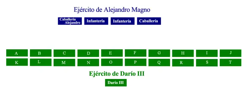 Alejandro Magno disponía de un ejército de 47 000 hombres, que eran pocos si los comparamos con los de Darío, quien según los historiadores modernos reunió entre 100 000 y 240 000 soldados (cifra máxima debido a los problemas de suministro). La técnica del "martillo" y del "yunque", que fue la clave de las victorias de Alejandro hasta entonces, ya no podía conducir a la victoria, pues era en efecto imposible rodear a la totalidad del ejército persa.