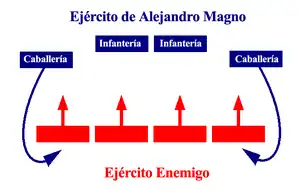 Las tácticas militares utilizadas por Alejandro Magno (356-323 a. C.) Demuestran que ha sido uno de los más grandes generales de la historia. Durante la Batalla de Queronea (338 a. C.), ganada contra los ejércitos ateniense y tebano, y las batallas del Gránico (334 a. C.) y de Issos (333 a. C.), ganadas contra el ejército persa de Darío III, Alejandro empleó la táctica llamada del «martillo y el yunque». Sin embargo, en la batalla de Gaugamela (331 a. C.), los persas poseían un ejército ampliamente superior en efectivos al ejército macedonio. Esta táctica de cerco por las unidades de choque rápidas no era muy factible. Alejandro tuvo que componer y decidir una formación de combate innovadora para la época: dispuso sus unidades en niveles; fingió querer rodear al enemigo para poder dividirlo mejor y así abrió una brecha en sus líneas defensivas.