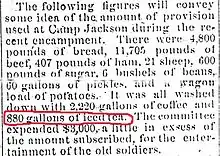 Igualmente, hay que tener en cuenta que en el periódico Nevada Noticer[3] del año 1890 (el 28 de septiembre), describiendo las grandes cantidades de comida y bebida que se servían en un encuentro de más de 15 000 ex-veteranos de la confederación en Nevada, Misuri (EE.UU), se menciona el consumo de 880 galones de té frío (equivalente a 3300 litros).[4] El artículo sobre "Camp Jackson", el nombre del encuentro que duró varios días, revela el consumo de carne que se prepararía en la barbacoa y el "Ice Tea" que acompañaría la comida, pero lo interesante es la forma de mencionarlo - como si el lector supiera lo que es "Ice Tea". Esto ha llevado a los experto a dudar, si la Exposición Mundial de Saint Louis realmente fue el sitio donde nació el "Ice Tea" o si ya se estaba consumiendo mucho antes. La prueba está tanto en el artículo publicado y en los comentarios de Pat Villmer de la asociación de la Exposición mundial de Saint Louis (St. Louis World's Fair Society) quien declaró: "El té helado no se "inventó" en la Exposición Universal. La buena gente del Sur servía té helado en sus casas mucho antes de la Feria. Sólo se popularizó en la Feria. En el Sur se llamaba té dulce y se servía frío, no caliente, en verano. Se utilizaba hielo, cuando estaba disponible. Recuerde, el hielo era la prima en los primeros días antes de la refrigeración, no el téa.[5] que traducido sería "El té frío no se inventó en la feria mundial. Los ciudadanos del sur servían te frío en sus casas mucho antes de la feria. Simplemente se popularizó en la feria. Se le llamaba té dulce servido en frío y no en caliente durante los veranos en el sur. El hielo se le añadía si en la casa había. Hay que recordar que hielo era un lujo antes de que existiera el refigerador, no el té.