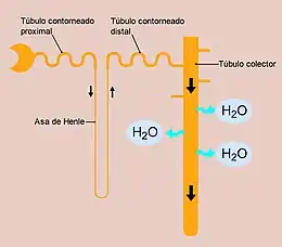 A través de los túbulos colectores circula el filtrado glomerular que se concentra de forma progresiva hasta constituir la orina. En el túbulo colector la acción de la hormona antidiurética provoca una intensa reabsorción de agua hasta que el contenido tubular alcanza una concentración de 300 mOsm/Kg.