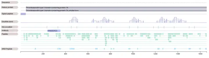 La THSD7A ("Thrombospondin type 1 domain containing 7a") es un tipo de proteína extracelular transmembrana caracterizada por poseer muchos dominios TSR. Pertenece a la familia de las trombospondinas (TSP), la cual es un amplio grupo de glicoproteínas. La gran mayoría está ubicada a nivel de la placenta y el cordón umbilical.[1] Además, está relacionada con la organización del citoesqueleto, la migración celular y con la formación de los filopodios.[2]