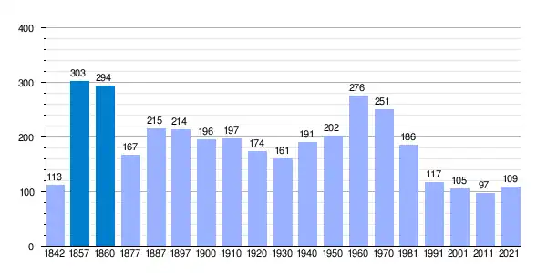 | Gráfica de evolución demográfica de Tabera de Abajo[8] entre 1842 y 2021 |