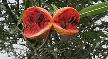 El fruto es carnoso y folicular, de color amarillo a anaranjado-rojizo al madurar, muricados por fuera, y con el ápice obtuso; miden de entre 2 y 3,4 cm por entre 1,3 y 2,2 cm. Las semillas miden entre 6,5 y 7,5 mm, y presentan un arilo de color rojizo o anaranjado.
