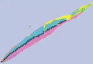 - Más allá de la línea del límite de inestabilidad de protones a lo largo de la esquina superior derecha, los nucleidos se desintegran por emisión de protones. Solo se han establecido líneas de límite de inestabilidad para algunos elementos.