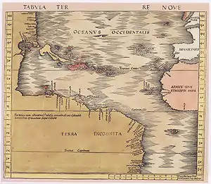A diferencia de lo que el propio Waldseemüller había hecho en su planisferio de 1507, la parte de América del Sur comprendida en el mapa no se denomina América, sino Terra incognita, con una leyenda que indica: «esta tierra y las islas adyacentes han sido descubiertas por Colón el genovés por mandato del rey de Castilla»[1] Este cambio en la denominación, y la expresa atribución del descubrimiento a Colón de las tierras y no sólo de las islas antillanas, suele interpretarse como una rectificación del autor, quien estaría corrigiendo de este modo la anterior atribución del descubrimiento a Americo Vespucio.