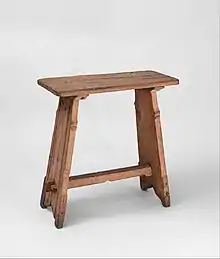 Los de carpintería se componen de una tabla de cualquier forma de las indicadas, a la que van ensamblados los pies, ya sean torneados o piramidales, y enlazados por unas chambranas, que son tablas de canto y ensambladas a los pies, las cuales chambranas cumplen el doble objeto de afirmar la posición de los pies y asegurar su unión con el asiento. Para manejarlos se les suele hacer un taladro T en forma de ese, por el cual se introduce la mano para asir el mueble. Con el fin de que no se lastime la mano al levantarlo, el taladro lleva las aristas redondeadas.