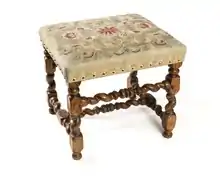 Los de tapicería son iguales a los de ebanistería, excepto en el asiento, que es un bastidor sobre el cual se arma el relleno de tapicería; a estos taburetes se les suele poner en torno del asiento un fleco de pasamanería o cordonero. Aunque algunas personas[¿quién?] dan a estos taburetes el nombre de puf, el puf es más bien una especie de sofá bajo, pero sin respaldo ni brazos, en el que pueden sentarse una o más personas, mientras que el taburete sólo sirve para una.