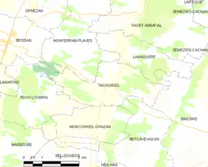 Tachoires es una población y comuna francesa, ubicada en la región de Mediodía-Pirineos, departamento de Gers, en el distrito de Auch y cantón de Saramon.