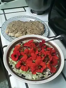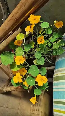 Tropaeolum: nombre genérico conocido como la capuchina de jardineros, aunque no de los botánicos, y nombrado por Linneo, que deriva del griego tropaion y del latín tropaeum de "trofeo", por la manera en que crece la planta, sobre un soporte. recordando un trofeo clásico con escudos y cascos de oro como las que colgaban como un signo de la victoria en un campo de batalla.[2]