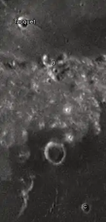 Tacquet B, de 14 km de diámetro, está al sureste, y en su interior contiene un cráter más pequeño que cubre aproximadamente una cuarta parte del diámetro, formando un cráter doble. Más al sur-sureste se halla Tacquet C, de 6 km de diámetro.