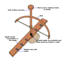 La posición habitual que asume una persona mientras opera el taladro de arco es la siguiente: la rodilla derecha se coloca en el suelo (suponiendo que sea un operador diestro) y el arco del pie izquierdo descansa sobre la tabla, fijándola en su lugar. Mientras la mano izquierda sujeta el bloque de rodamiento, la muñeca izquierda se engancha alrededor de la espinilla y se traba en su lugar para mantenerla estable, de modo que pueda generar suficiente presión y velocidad hacia abajo; esto se logra empujando hacia abajo con el cojinete a la vez que se gira la broca. El calor de la fricción entre la tabla y la broca crea polvo carbonizado y difuso y hace que se encienda, formando una brasa. El cojinete está lubricado y el husillo está tallado a un grosor aproximado del pulgar, generalmente de 150 a 250 milímetros (6 a 10 pulgadas) de largo. Otra opción para practicar es hacer la "agarradera" en una pieza de "embocadura", por lo que se mantiene presionada desde la barbilla / boca, dejando ambas manos libres.[5]