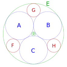 Tomando uno de los dos círculos de Apolonio – por ejemplo E. Este posee un punto de tangencia con respecto a los círculos A y B, de esta forma la tripleta de circunferencias E, A y B tiene de nuevo sus propios dos círculos de Apolonio. De esta forma se sabe que uno de ellos es C – y el otro corresponde a un nuevo círculo G. Si continuamos con el procedimiento se logrará encontrar otra circunferencia F que es tangente a E, B y C, e igualmente otra circunferencia H construida de E, C y A. De esta forma aparecen otras tres nuevas circunferencias. Se puede construir otros nuevos tres círculos empleando D en lugar de E junto con A, B y C, proporcionando seis nuevos círculos al conjunto inicial. Junto con los A a E, esto proporciona un total de once círculos.