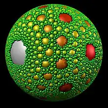 El tamiz de Apolonio (denominado también en la literatura como empaquetado de Leibniz y empaquetado apoloniano) en geometría es un fractal generado por conjuntos de circunferencias mutuamente tangentes densamente empaquetadas en una circunscrita. El nombre se debe al matemático griego Apolonio de Perga del siglo III a. C.[1] El tamiz es un fractal autosemejante que posee una dimensión de Hausdorff desconocida, pero de la que se sabe que es alrededor de 1.3057,[2] y que es mayor que la de una curva regular o rectificable (d = 1) pero más pequeña que la de un plano (d = 2). A pesar de su denominación, es precisamente el matemático alemán Gottfried Leibniz quien describe por primera vez el tamiz de Apolonio ya en el siglo XVII, siendo el precursor curvo del triángulo de Sierpinski del siglo XX.[3]