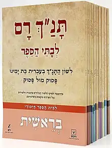 Como todo libro escrito en hebreo y otros idiomas de escritura derecha-izquierda, la tapa de cada tomo se encuentra en el lugar de la contratapa, de modo que el libro debe leerse en sentido opuesto a un libro escrito en una lengua occidental. El texto de cada uno de los libros de la Biblia está presentado en hebreo antiguo a la derecha y a la izquierda en hebreo moderno como columna paralela y en una tipografía distinta. Al final de cada tomo se encuentra una sección con tablas de pesos y medidas ideada como referencia para el lector.