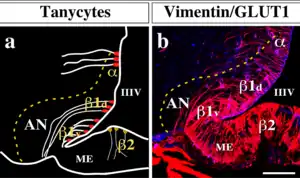 Los tanicitos beta-1 forman la barrera del Núcleo Arcuato que separa este núcleo de la Eminencia Media.[9]