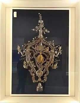 Lo forman una girnalda en el extremo inferior rematada en una representación campaniforme y dos guirnalas superiores que se unen por sus extremos. Corona la estructura la figura de un cacique que sostiene en su mano izquierda un puñal y en la derecha una lanza coronada por un gorro de manga. Cuatro figuras humanas, sosteniendo sendos escudetes, completan la joya. A través de los textos escritos en los mismos puede leerse un poema dedicado al General Belgrano[14].